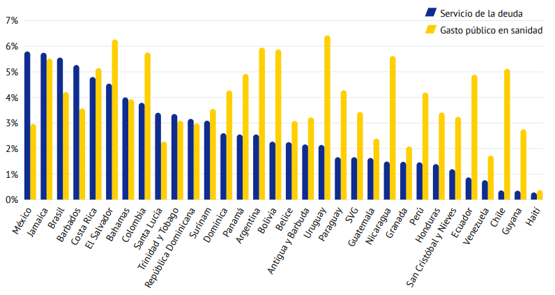 En términos prácticos, los gobiernos están desviando una parte cada vez mayor de sus presupuestos hacia los acreedores en lugar de hacia los ciudadanos. Como se muestra en la figura 3, entre 2021 y 2023, ocho países, entre ellos México, Jamaica, Barbados y Brasil, gastaron más en pagos de intereses que en salud pública.